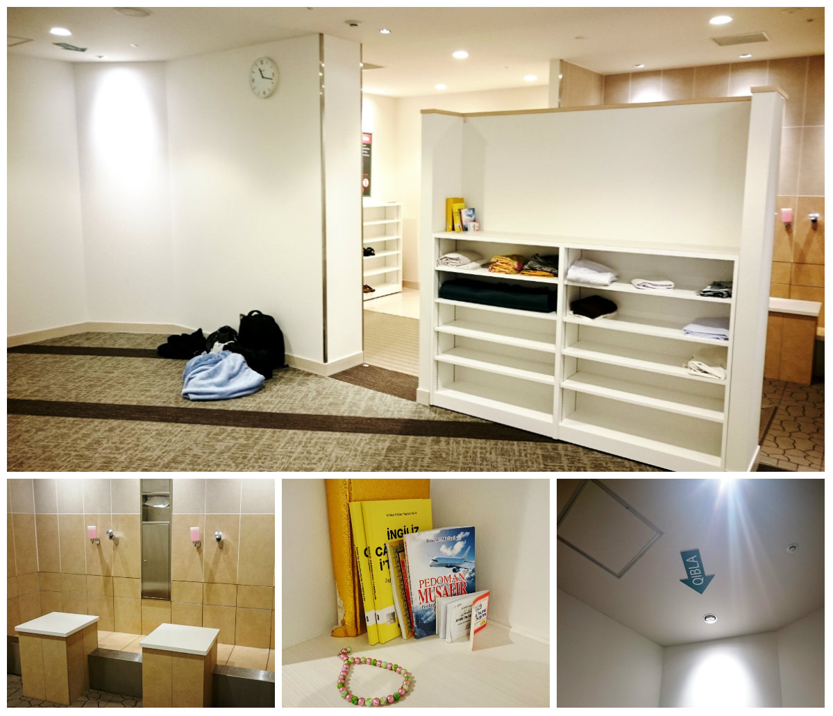 Seperti myoritas fasislitas umum di Jepang, mushola ini bersihnya luar biasa! Ada ruangan untuk pria dan wanita. Masing-masing terhitung luas untuk kategori mushola bandara di negeri minoritas muslim. Di dalamnya terdapat rak sendal/sepatu, tempat wudhu, sarung dan mukena, bahkan ada beberapa buku islami. Salah satu bukunya berjudul “Pedoman Musafir”, yes, dalam bahasa Indonesia!. Mungkin buku ini wakaf dari salah satu turis Indonesia?