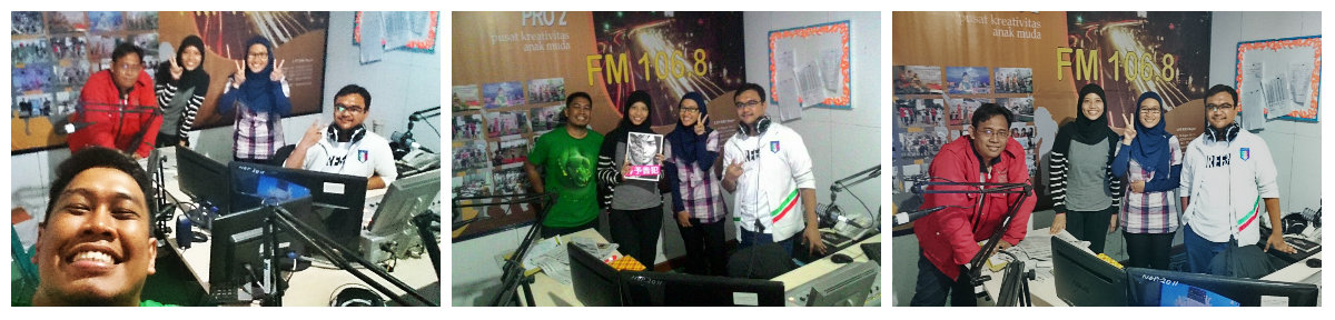 Sedikit cerita di belakang layar, sebenarnya kami grogi banget pas mau siaran. Untung para sempai Jamanlo supel dan asik, jadinya berasa ngobrol santai. Seperti biasa, ada Arif, Fahri, dan bocah tua nakal Delta yang siaran hari itu. Dari obrolan off-air, muncullah kisah klasik sempitnya Bogor: lokasi rumah kita ternyata ga jauh-jauh amat, masih tetangga satu kecamatan. Belum lagi, salah satu dari ketiga sempai ini ternyata adalah junior kami di kampus (ga usah disebut lah ya angkatan berapa :p). Bogor memang sempit, tapi Bogor kota indah sejuk nyaman *nyanyi*