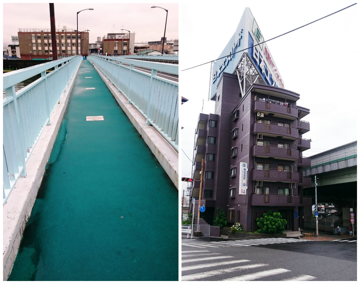 Once you arrived at the station, take the right hand side exit and follow the road as seen on the above picture. At the end of that road, there is a green bridge that leads you to the tall-brown building on the other side.