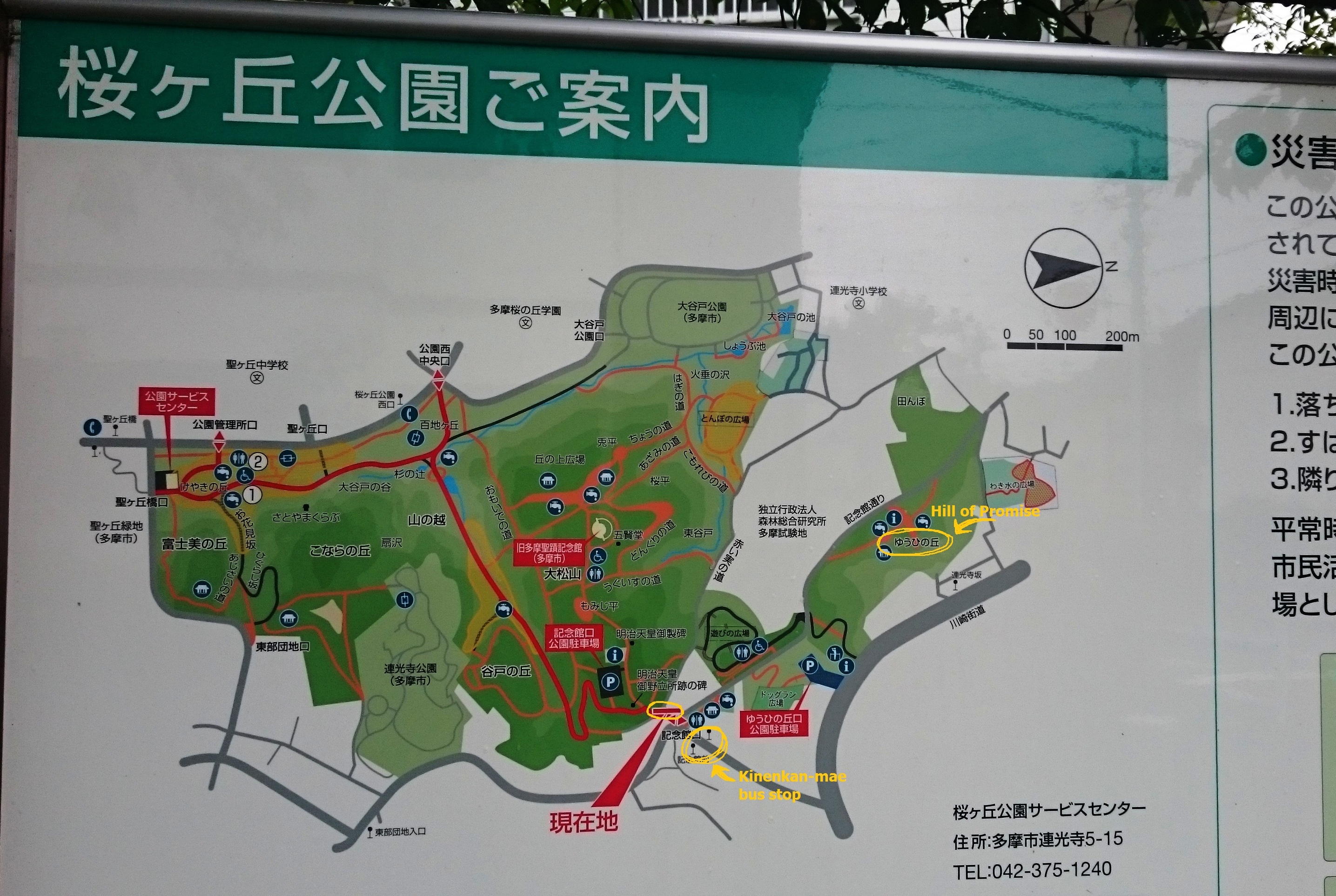 Once you arrived at Seiseki-sakuragaoka station, then walk into the nearby bus stop and take bus “sakura 06” (桜06) toward Nagayama station. Please take off at Kinenkan-mae (記念館前) bus stop (approx. 6 stops). Then soon you will see an entry to a park, BUT don’t walk into it because the hill is located on different area. Instead, take the small path on the right.