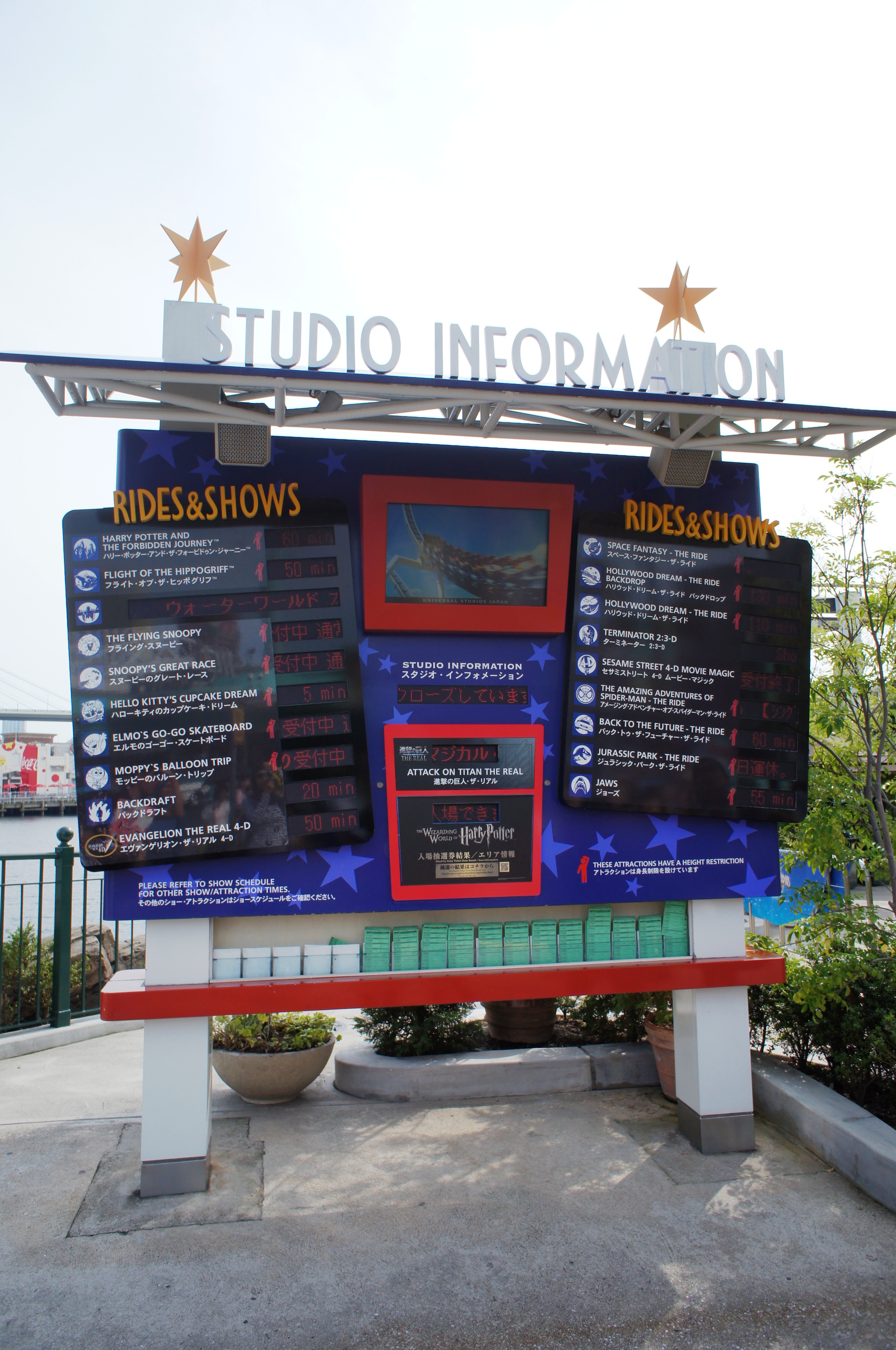 Universal Studio Japan terbagi dalam 7 area utama (Hollywood, San Fransisco, New York, Jurassic Park, Amity Village, Universal Wonderland, dan Waterworld) dan 2 area temporer (The Wizarding World of Harry Potter dan Cool Japan).Peta USJ dapat diunduh di sini. Oh iya, begitu masuk USJ akan ada papan informasi yang menunjukkan berapa lama antrian di tiap atraksi.