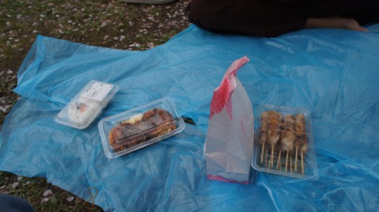 Ga bawa bekal untuk piknik ga jadi masalah karena di ujung Sakura Tunnel akan ada area bazaar yang menjual berbagai macam makanan. Ga punya tikar? Jas hujan atau pamphlet pun bisa jadi pengganti, hehe… Tapi ternyata tanahnya dingin…..