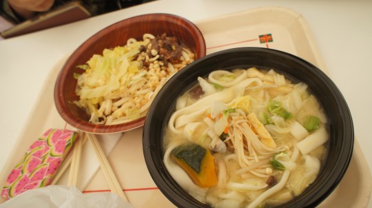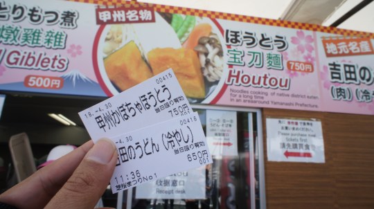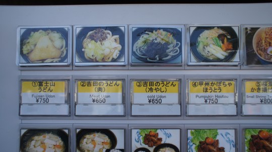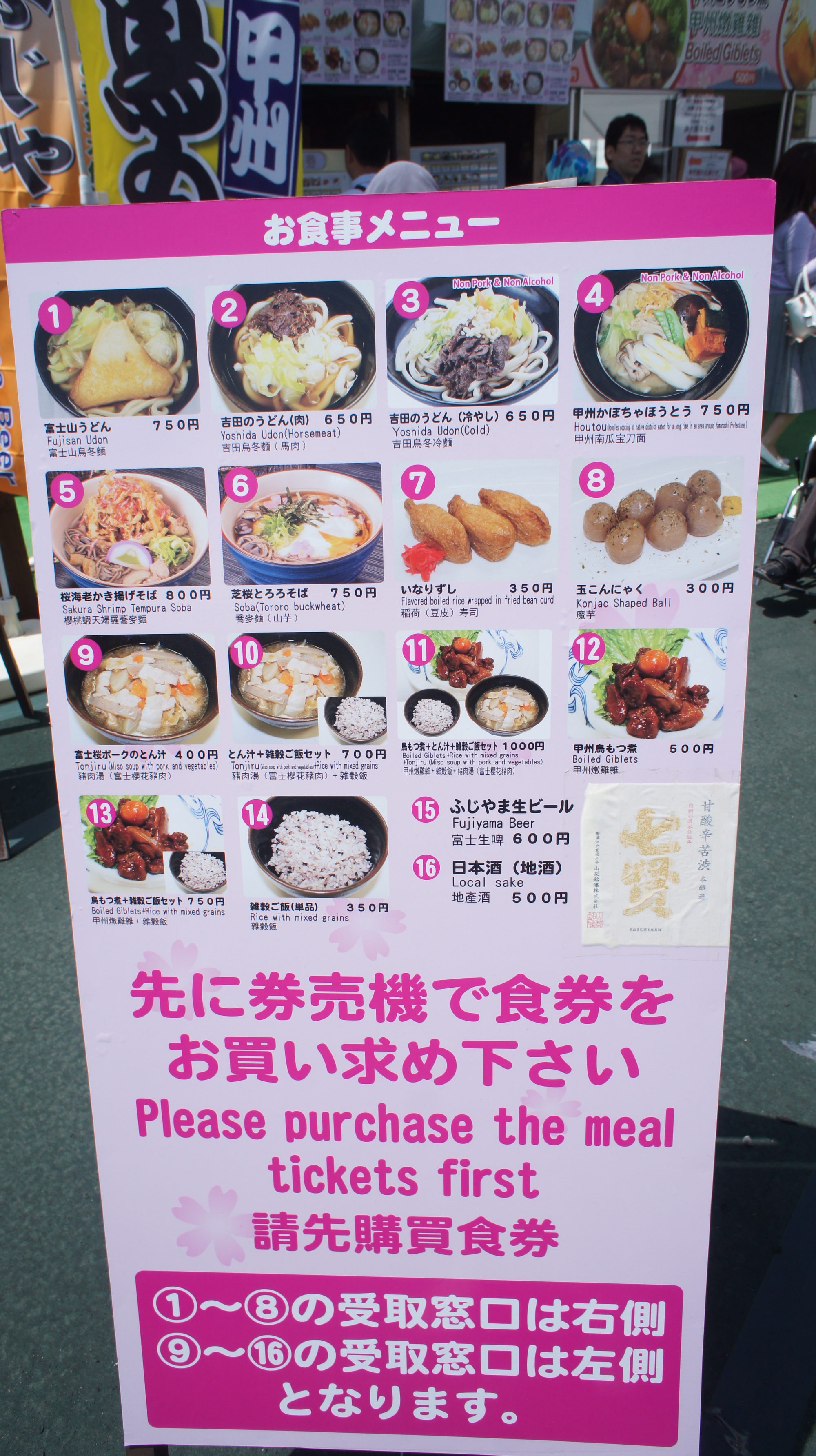 To buy the food, you need to purchase a meal ticket from vending machine. Then just give the ticket to any booth indicated by menu number.